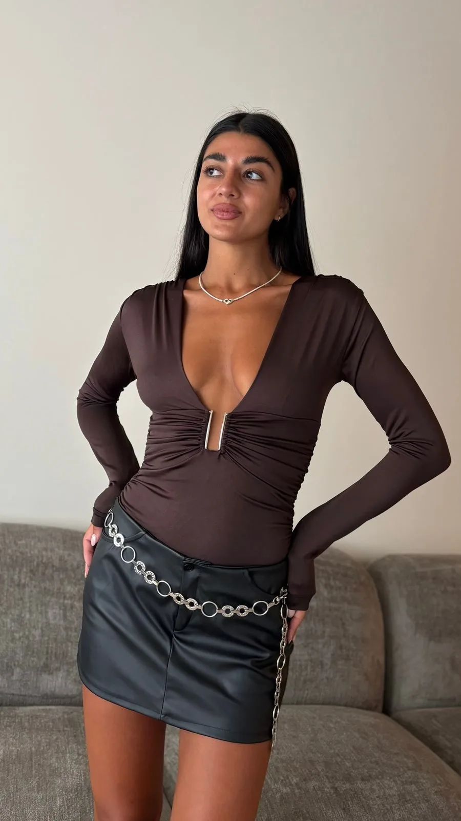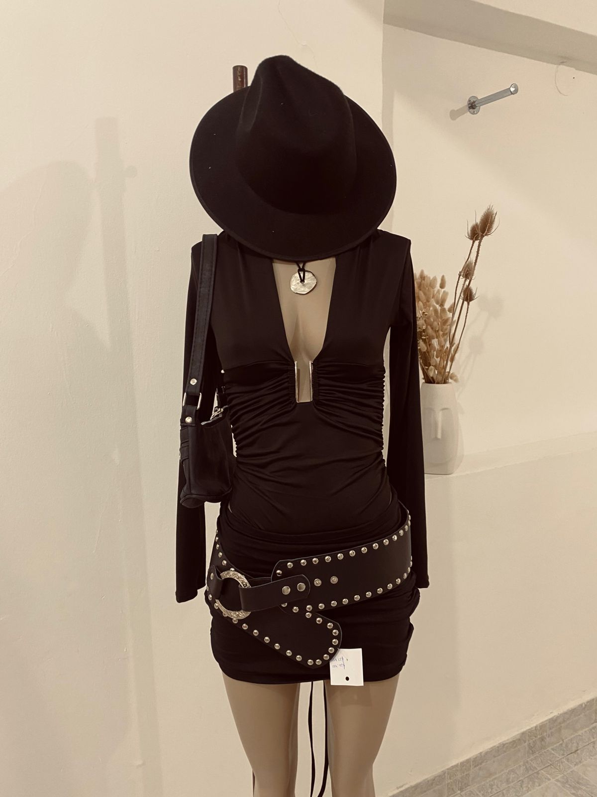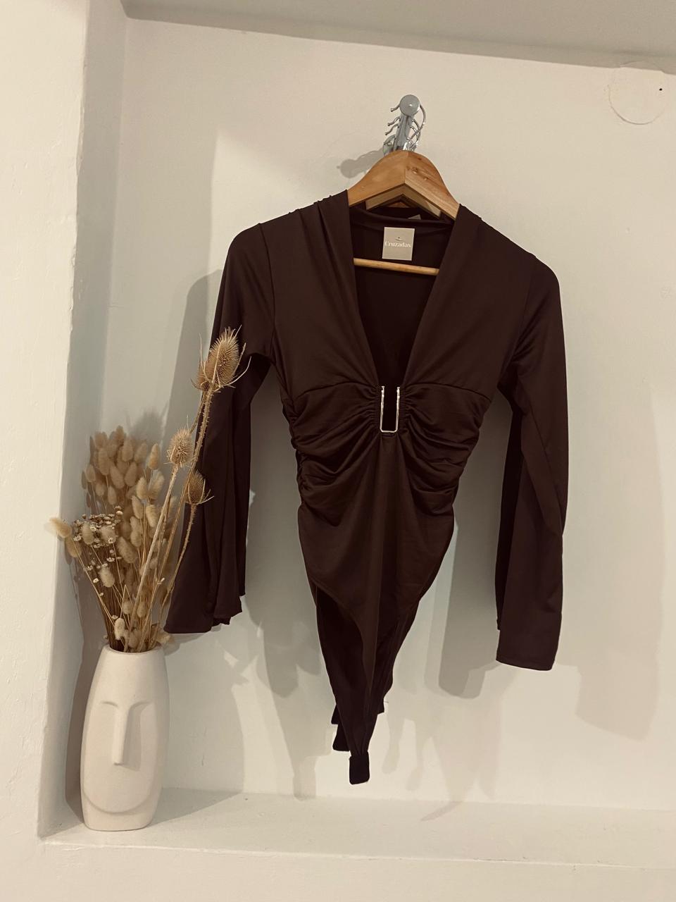 Body mangas largas con escote en V con detalle de hebilla, de microfibra con frunce a los costados y prendedores en la entrepierna. Talle único para un S/M.