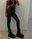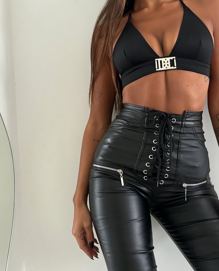 Pantalón de cuero ecológico, elastizado, tiro alto con detalles de cordones en el frente y cierres. Se recomienda un pedir un talle mas del que usa.