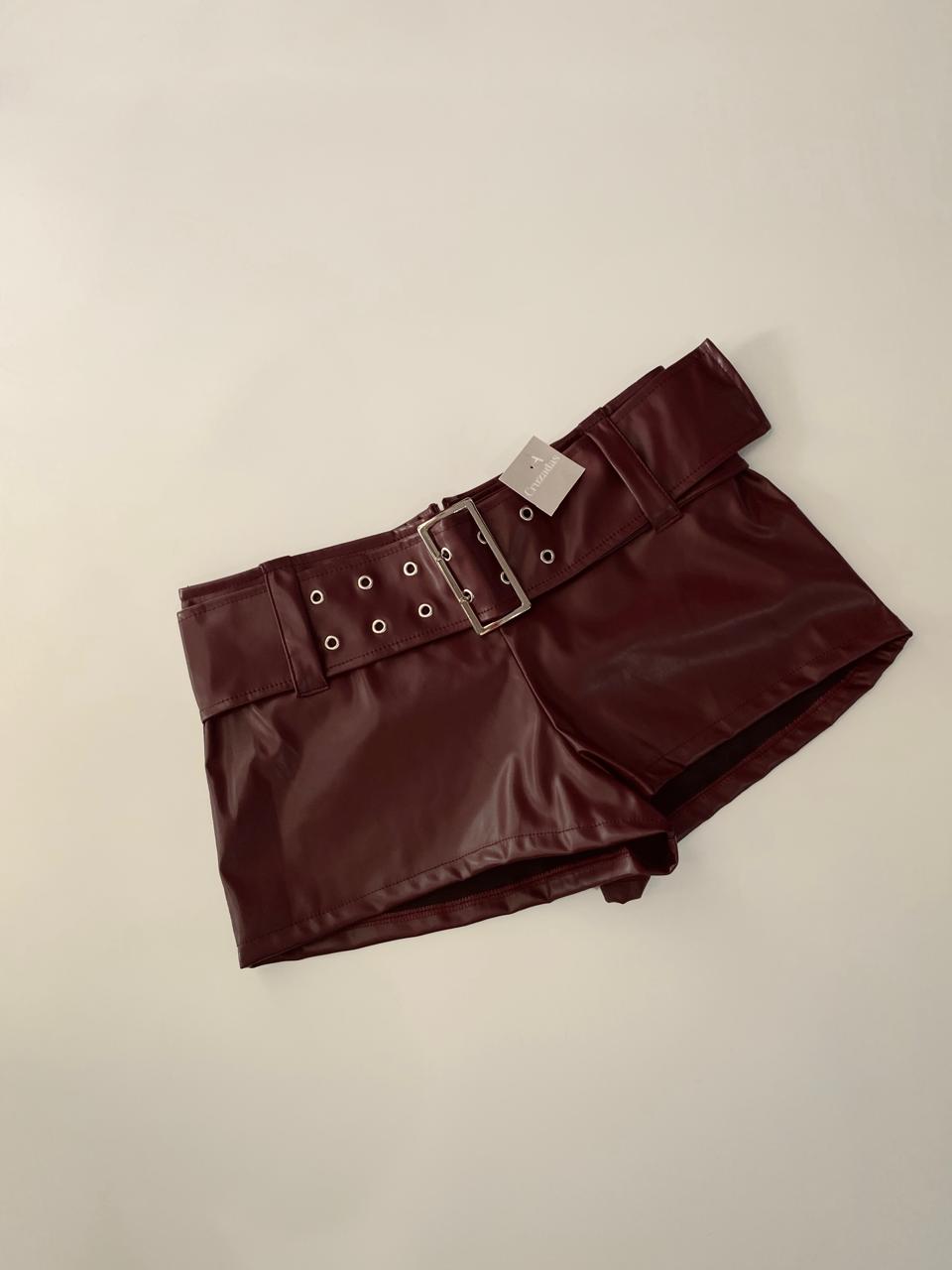 Short de cuerina con cinto y cierre indivisible atrás.