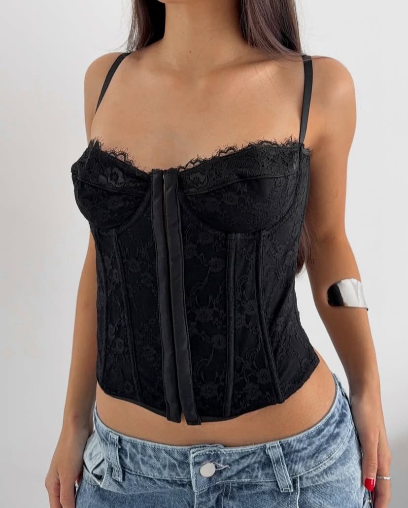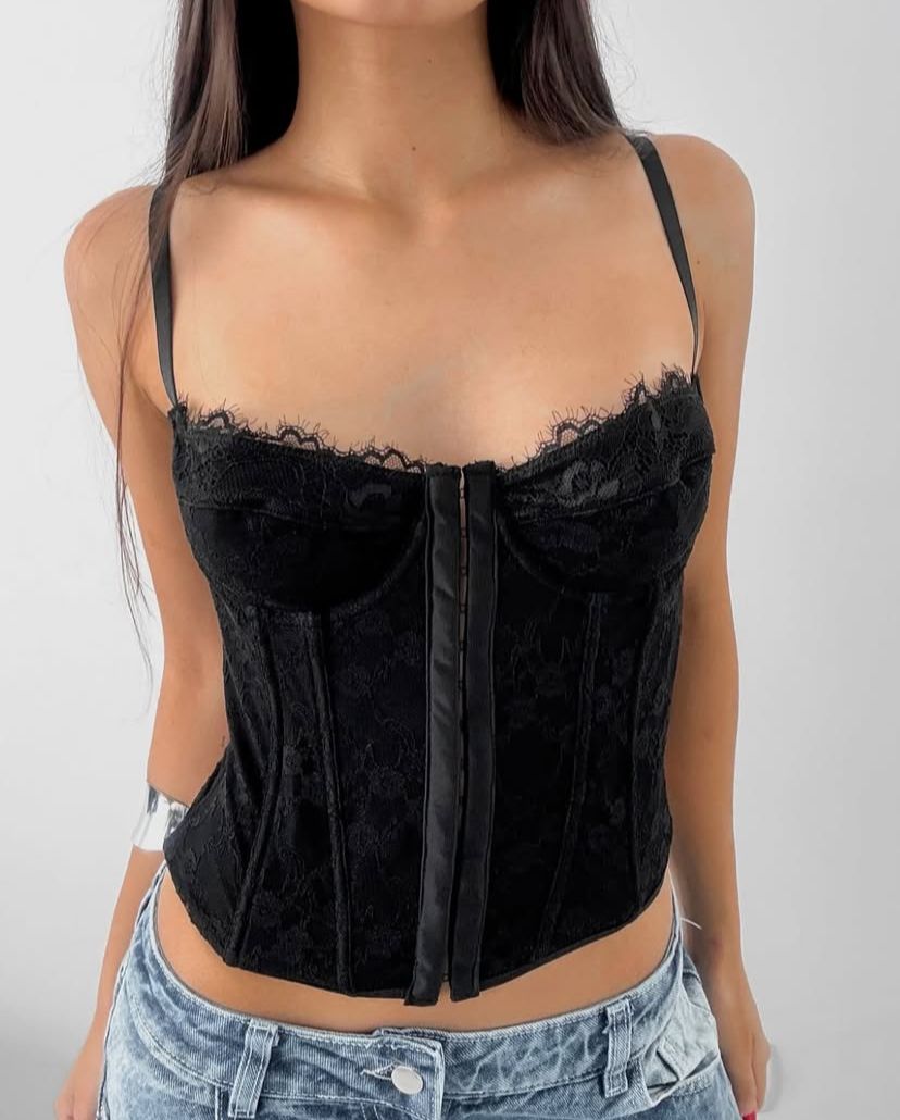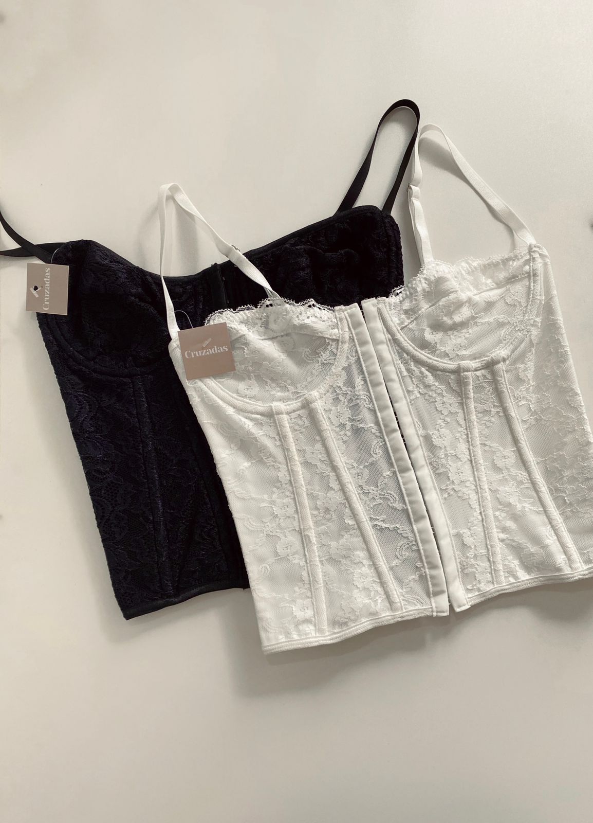 Corset importado, confeccionado enteramente de encaje forrado, con detalles en puntilla. Viene con cierre corsetero en el frente, tiras en la espalda, breteles regulables, varillas rígidas y aro. Excelente calidad y calce.
