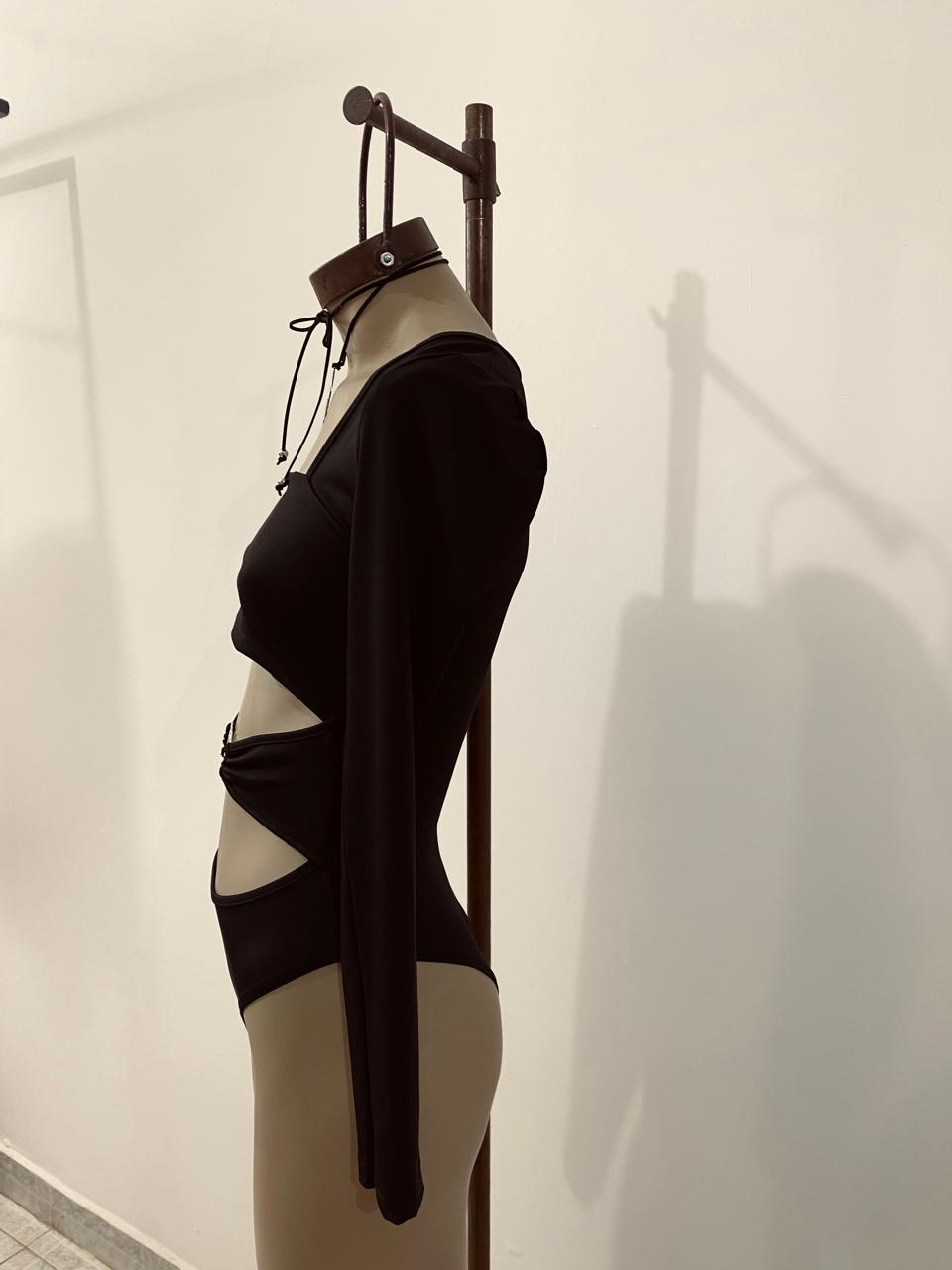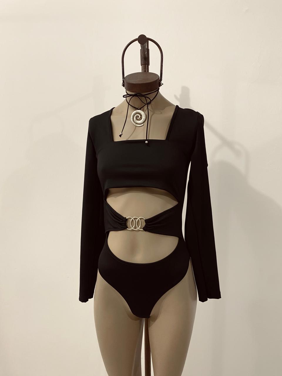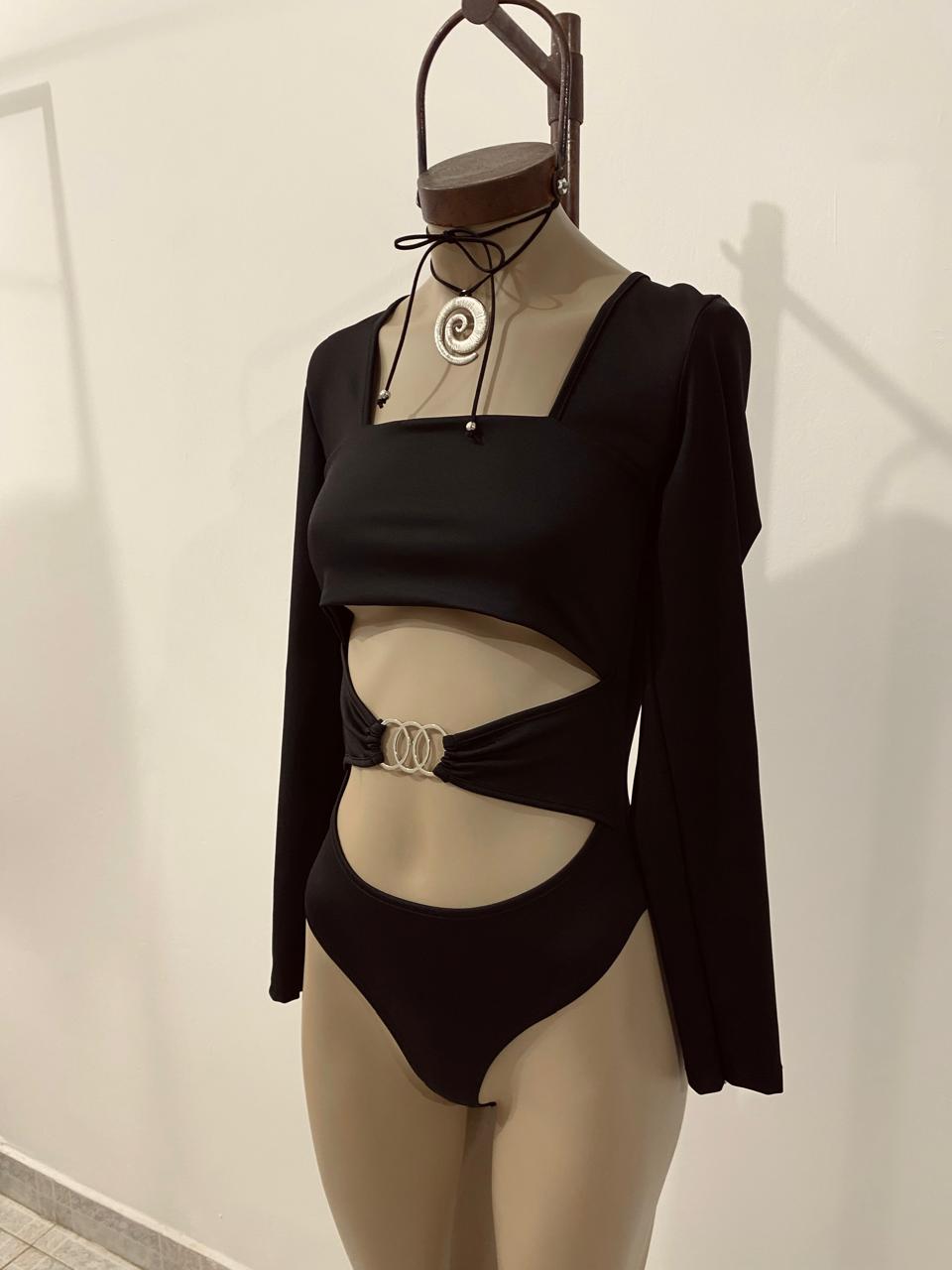 Body enterizo mangas largas, de lycra, con detalles de recortes y hebilla. Talle único para un S/M.