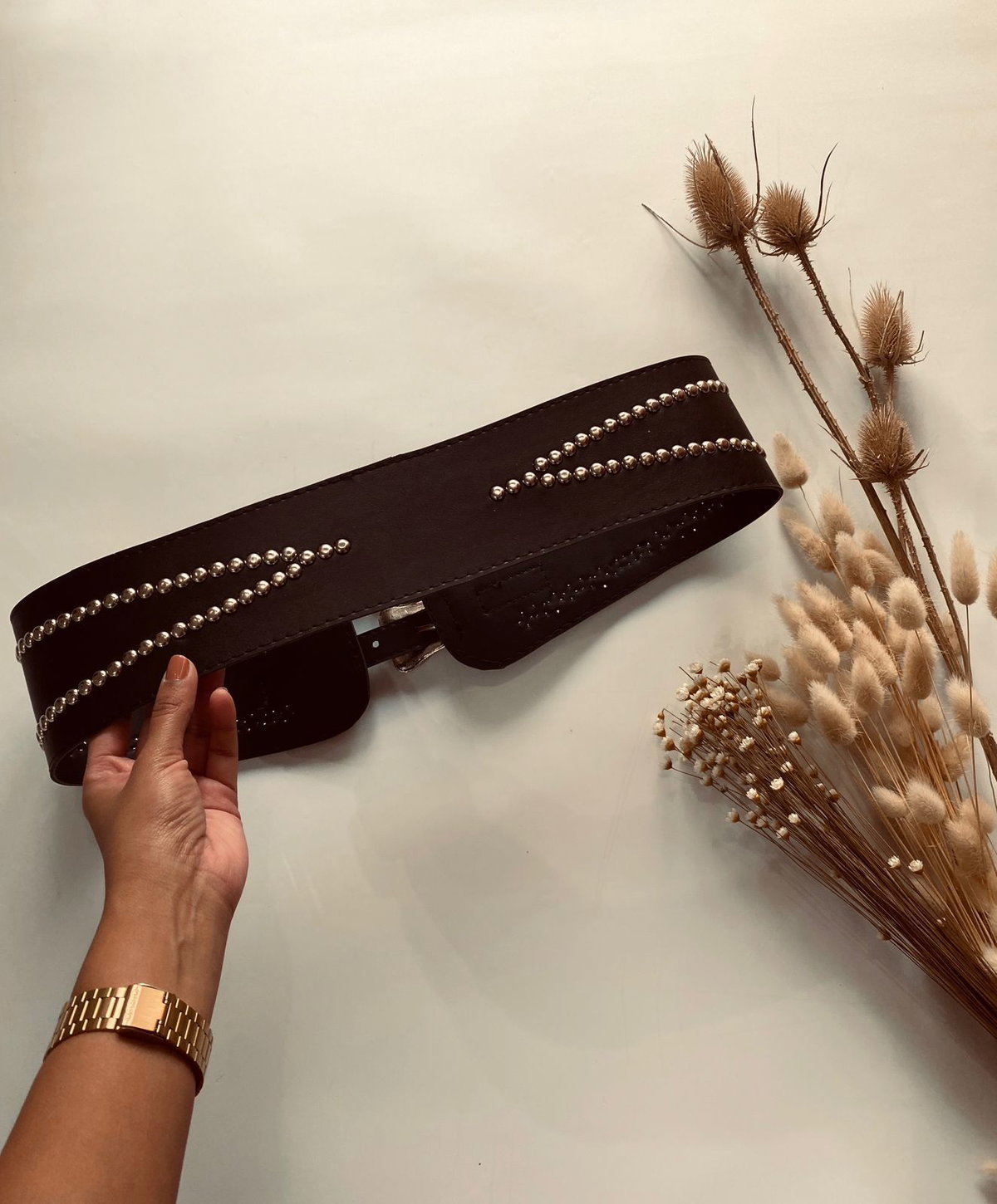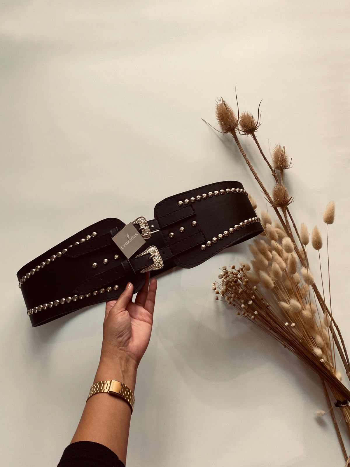 Faja cinto con diseño de tachas y doble hebilla.