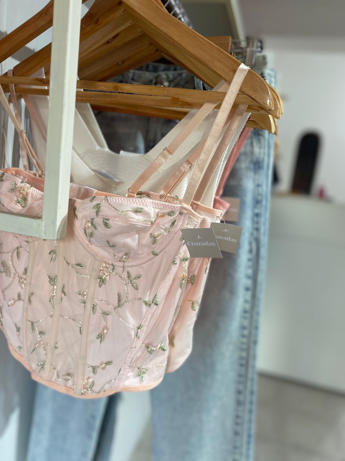 Corset enteramente de lycra en tono rosa palido, forrado con microtul bordado. Armado con aros y forro en el pecho, con varillas rigidas y breteles regulables. Cierre corsetero trasero. Excelente calidad.