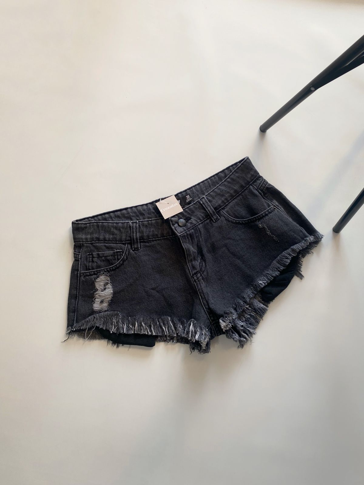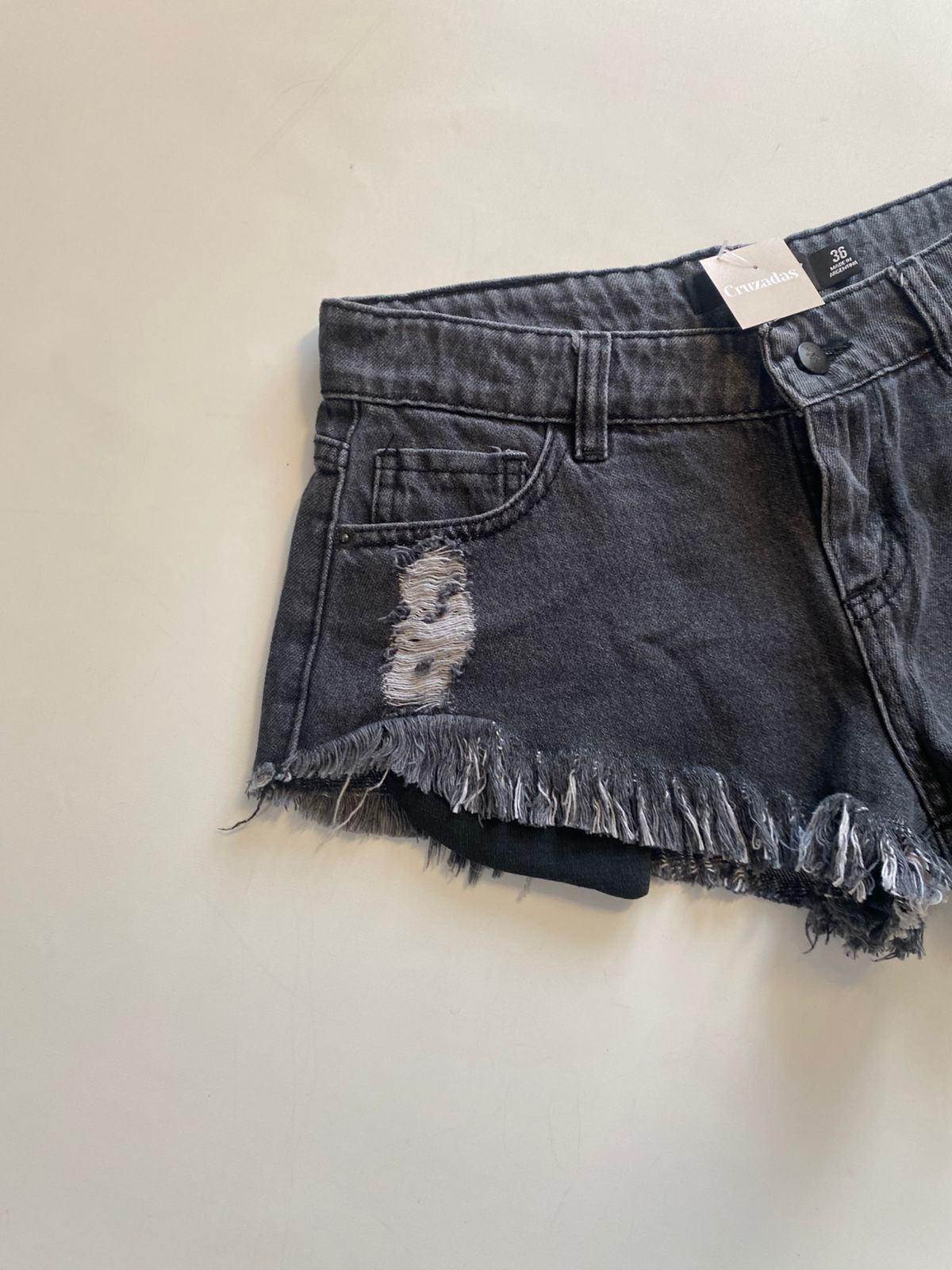 Short denim rígido tiro bajo, desgastado con detalle de rotura, desflecado.