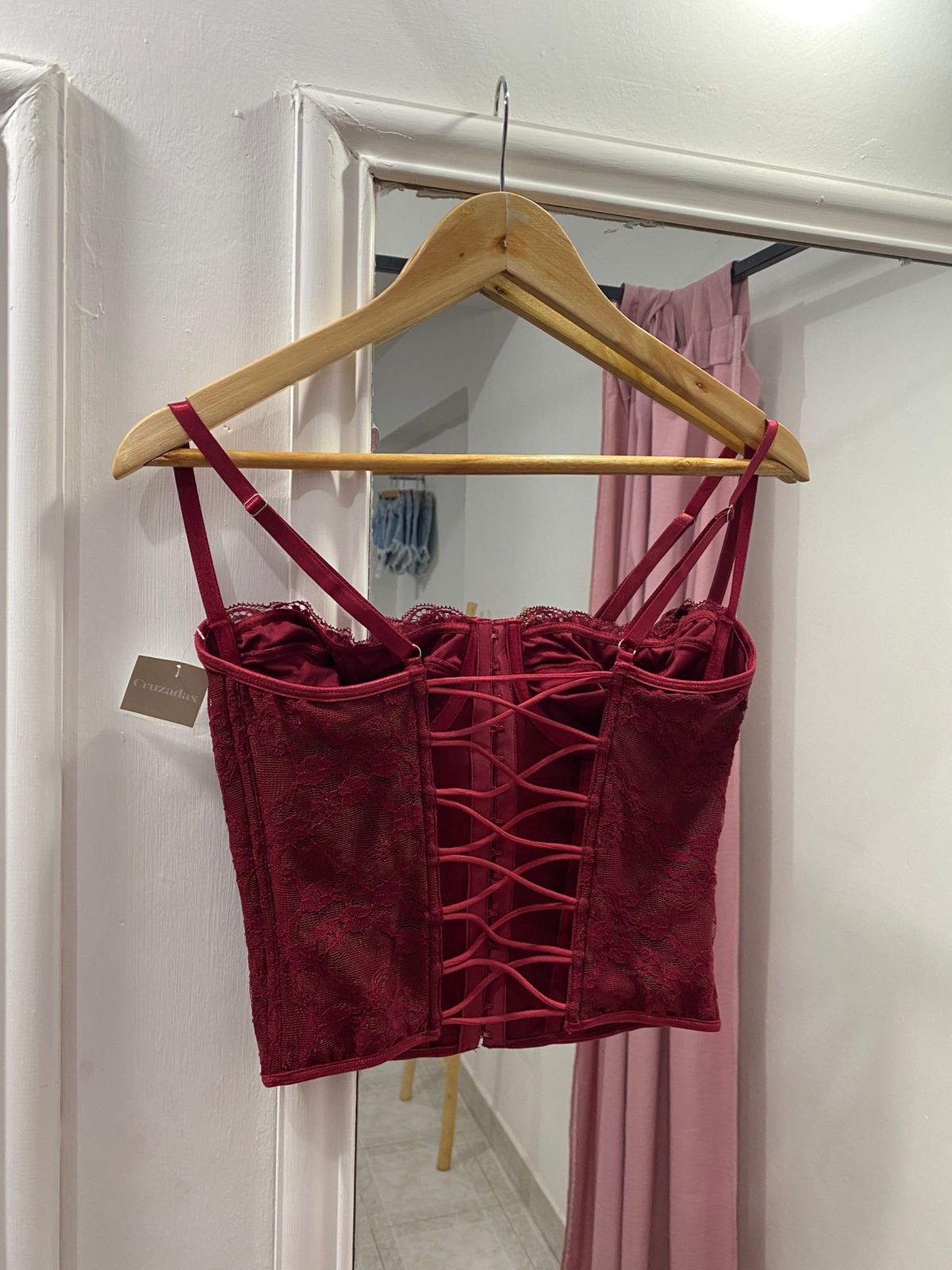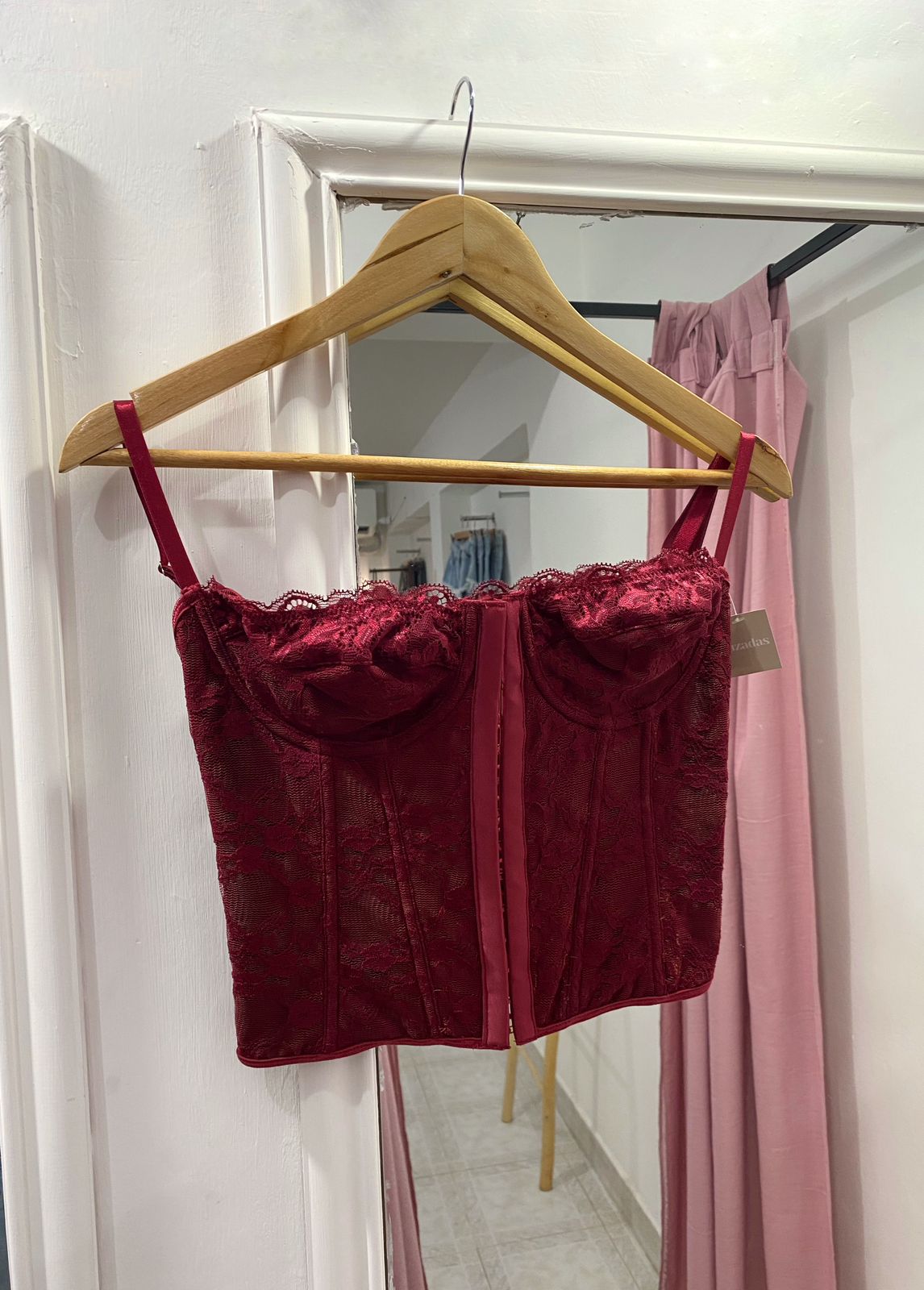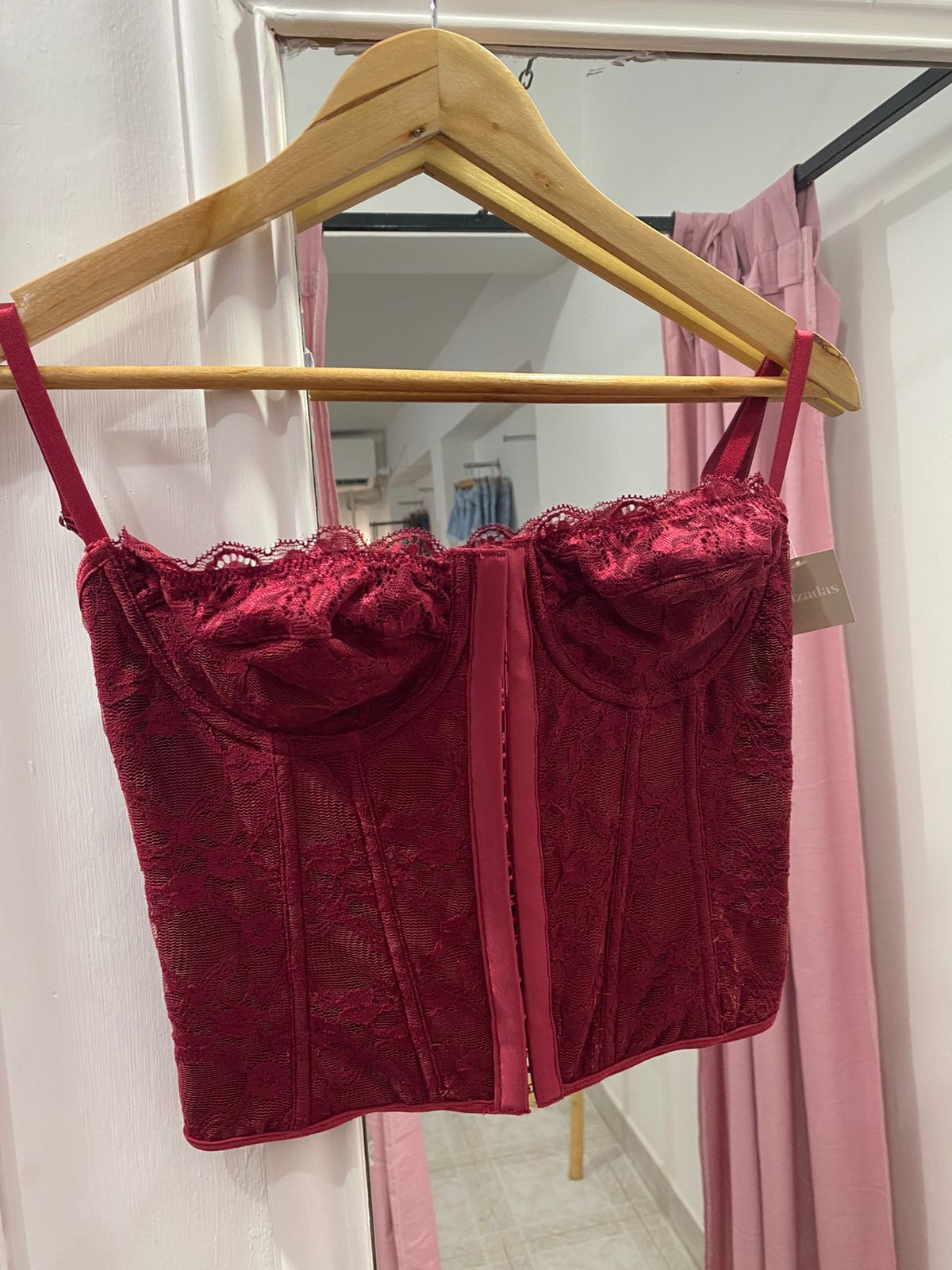 Corset importado, confeccionado enteramente de encaje forrado, con detalles en puntilla. Viene con cierre corsetero en el frente, tiras en la espalda, breteles regulables, varillas rígidas y aro. Excelente calidad y calce.