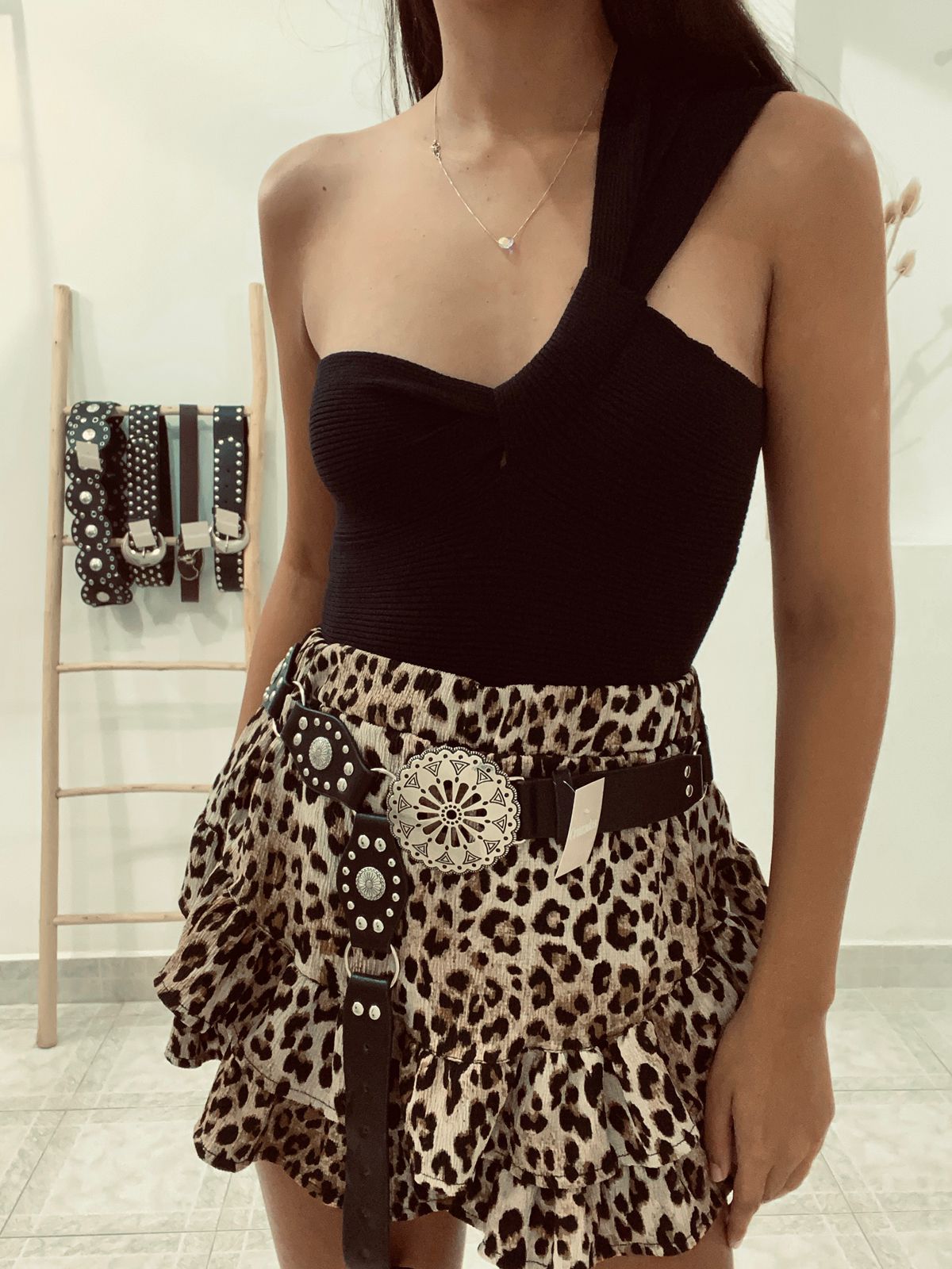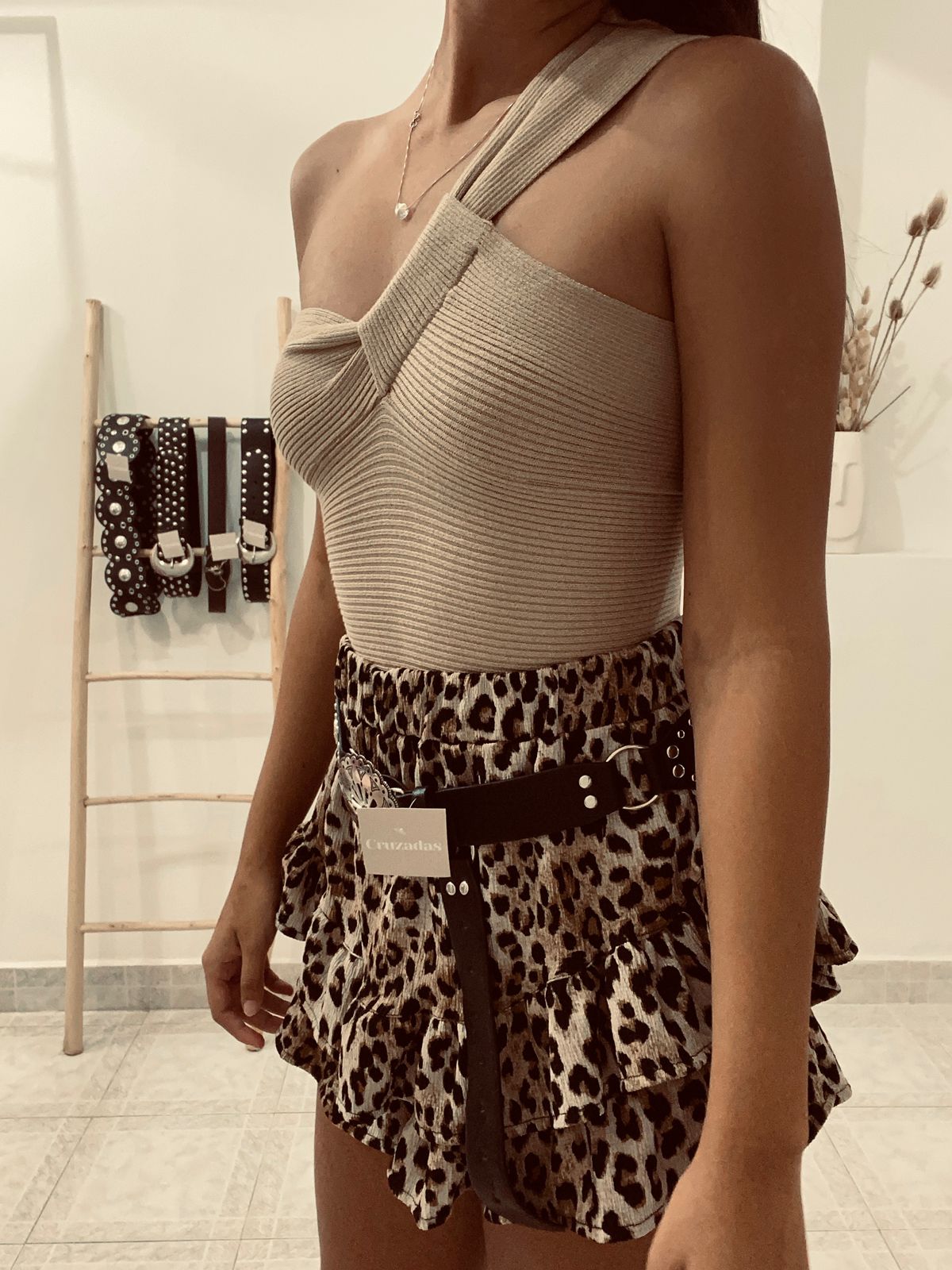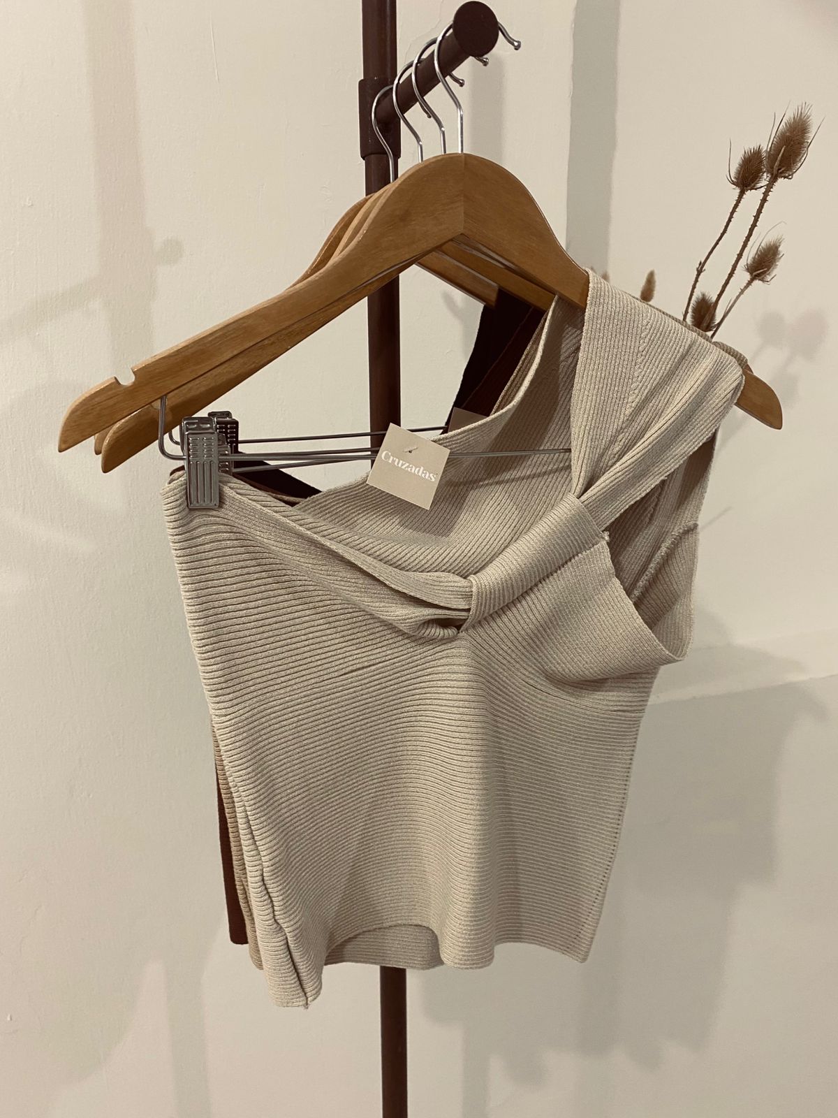 Musculosa de un hombro (larguita no es top) con detalle de nudo en el escote, de hilo de excelente calidad, grueso y elastizado. Talle único para un S/M.