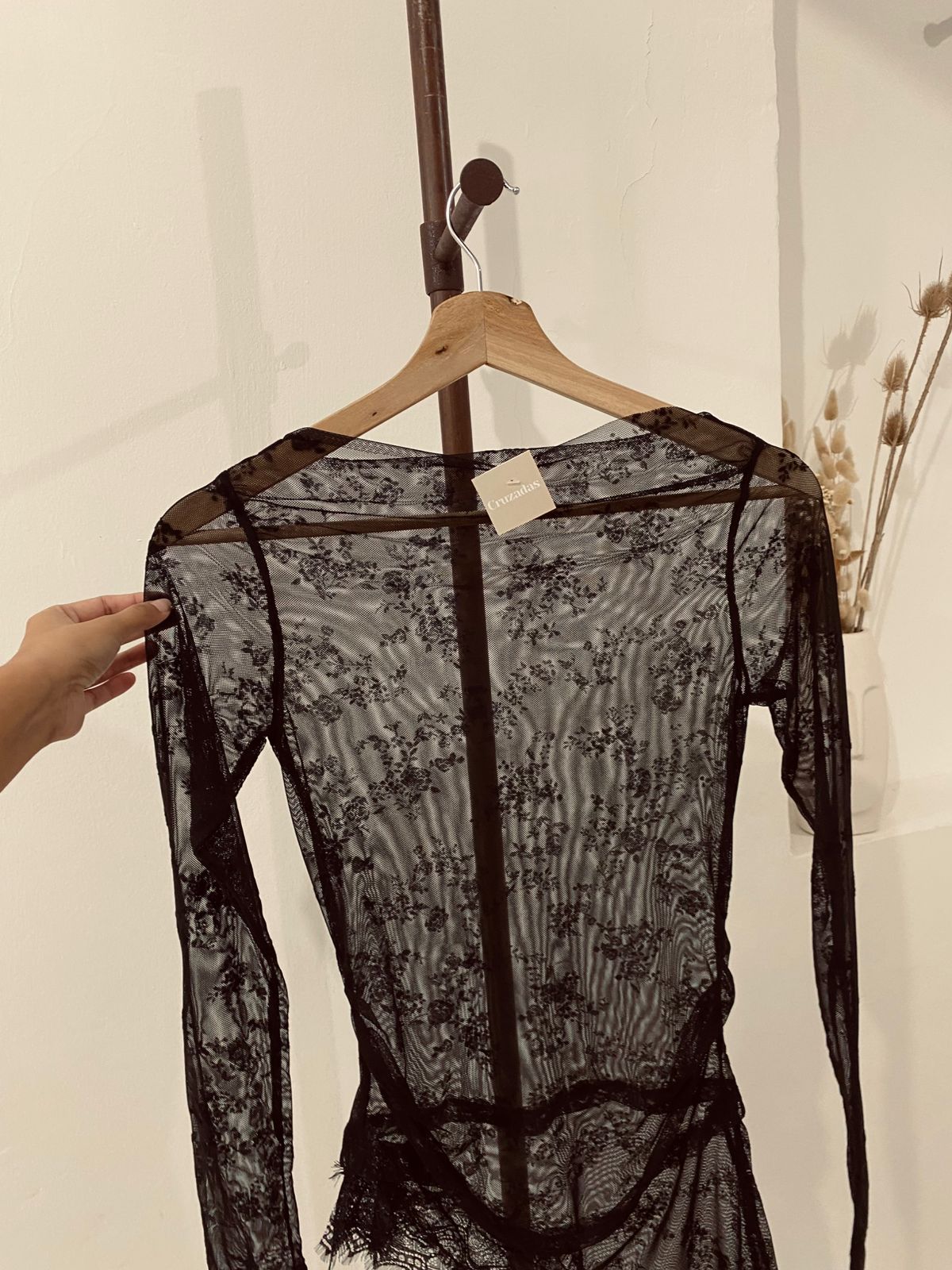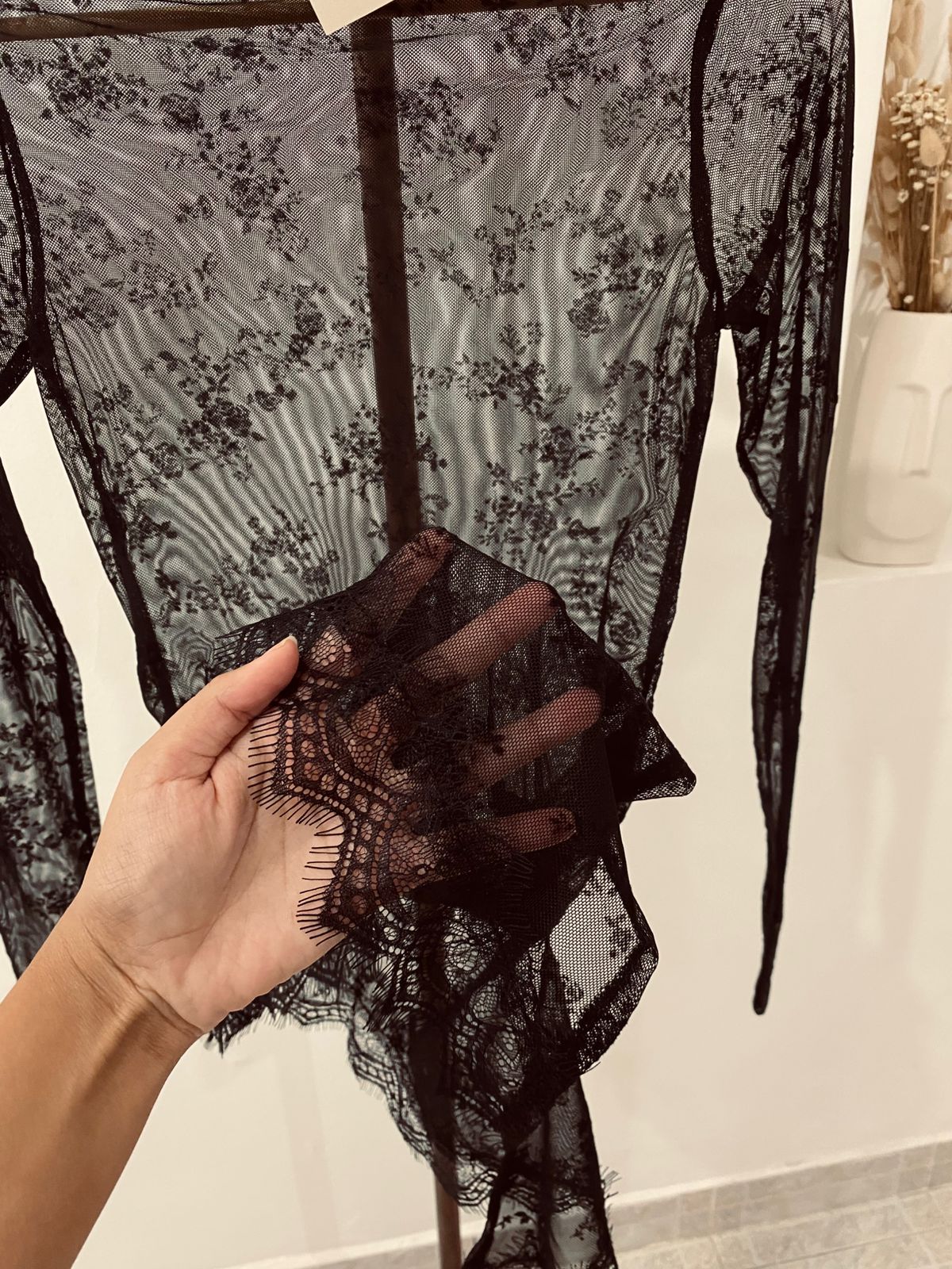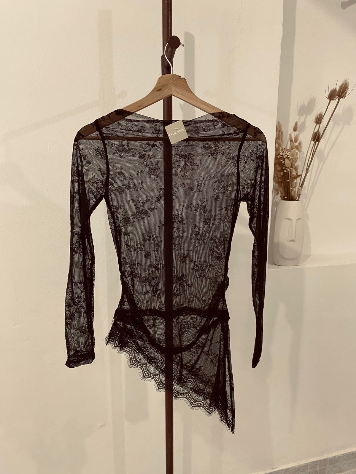 Remera mangas largas, enteramente de microtul estampado con diseño de florcitas y detalle de puntilla. Talle único para un S.