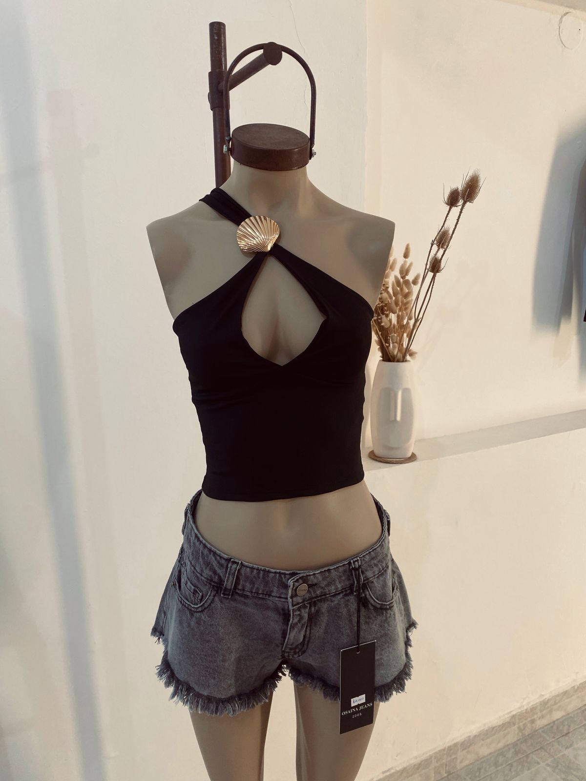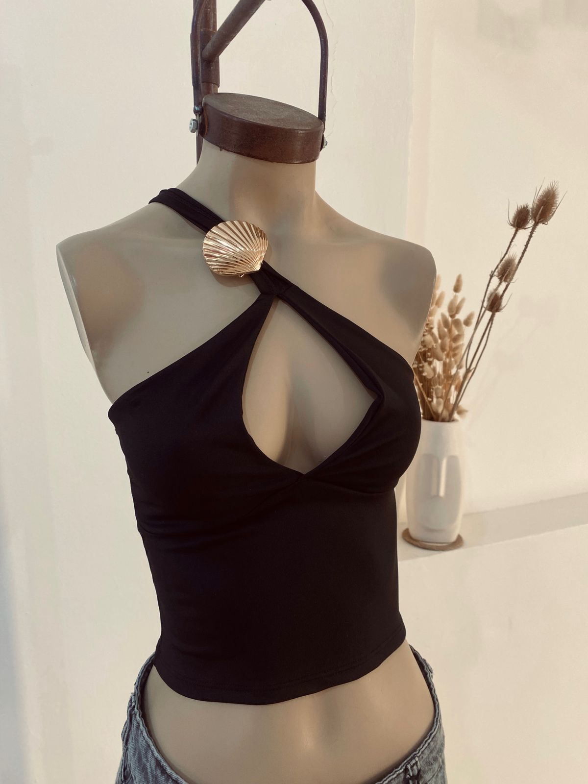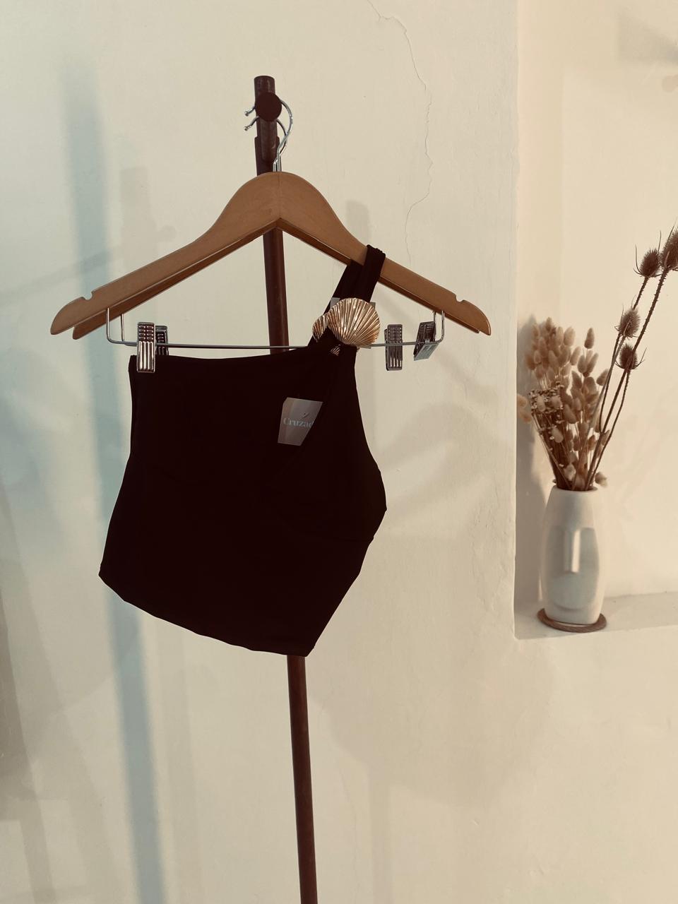 Top un hombro, de microfibra, con detalle en dorado. Talle único para un S/M.