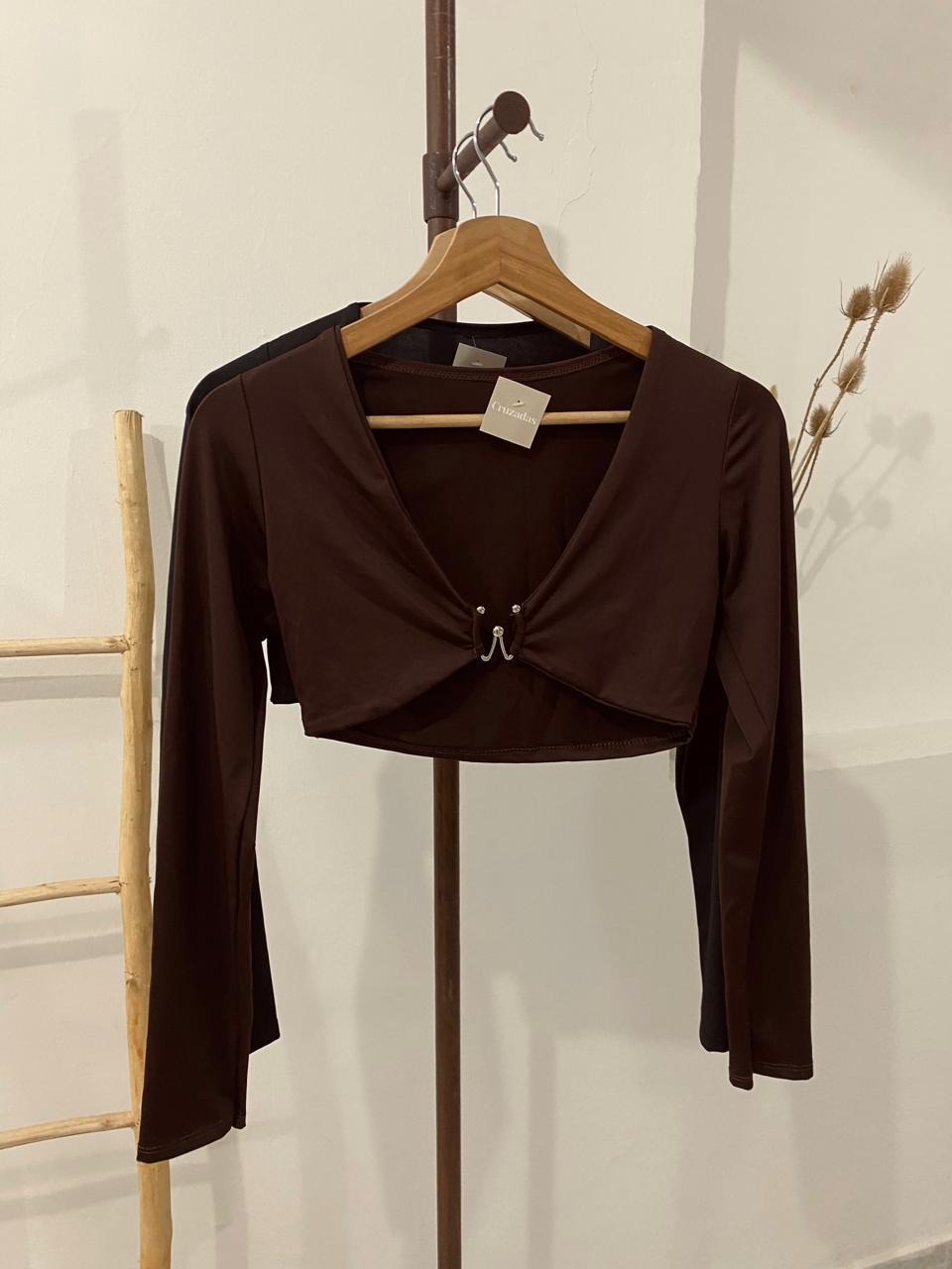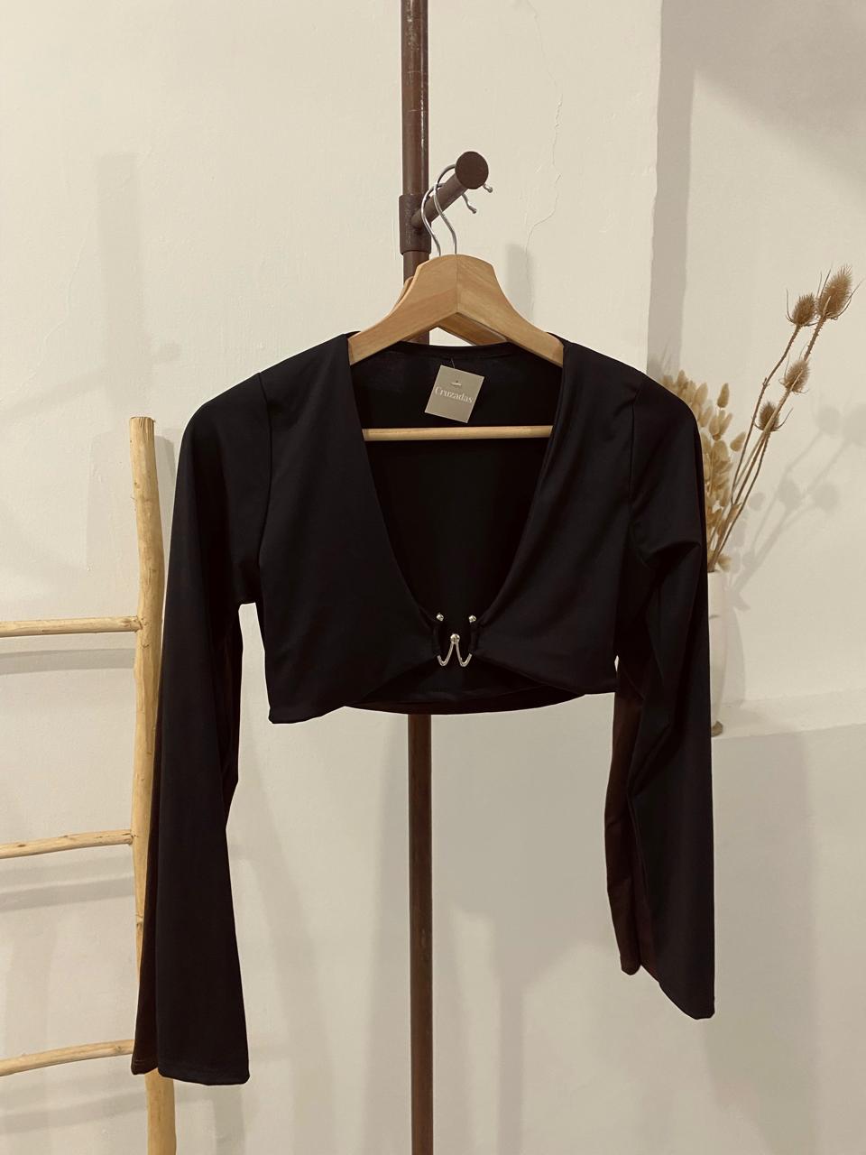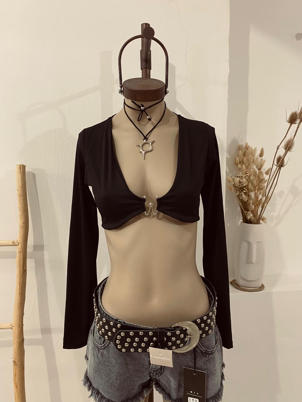 Top mangas largas, de lycra, con detalle de hebilla. Talle único para un S/M.
